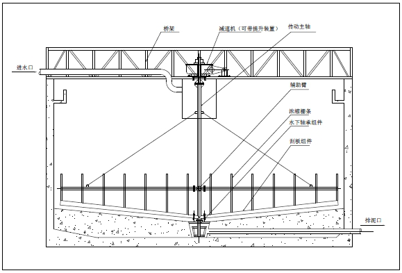 含有細(xì)粒物體的料漿或污水,經(jīng)槽架或污泥管給入濃縮池的中心部位,料漿做均勻輻射狀向周邊緩慢流動,在溫游中料漿或污水中的固體顆粒籍自重或絮凝作用而沉降。由于濃度較低,顆?;咀鲎杂谐两担了佥^快,繼而沉入濃集帶,沉速較慢。沉到下部一沉積帶,也是濃度較高的壓縮區(qū),水分從沉降顆粒的間隙中不斷析出。中耙架連續(xù)回轉(zhuǎn)時,耙齒對該部沉積物沿池底的錐形坡面逐級推向池底的中心處,由該處的排料口排出。中耙齒推進(jìn)沉積物時,也是刮板對沉積物的一個壓縮過程,這也大大的促使析水作用的加強,因而從排料口排出的沉積物時經(jīng)過濃縮的料漿或污泥。池上部是澄清帶,澄清液從池邊溢流堰排出,從而構(gòu)成濃縮機工作的全過程。